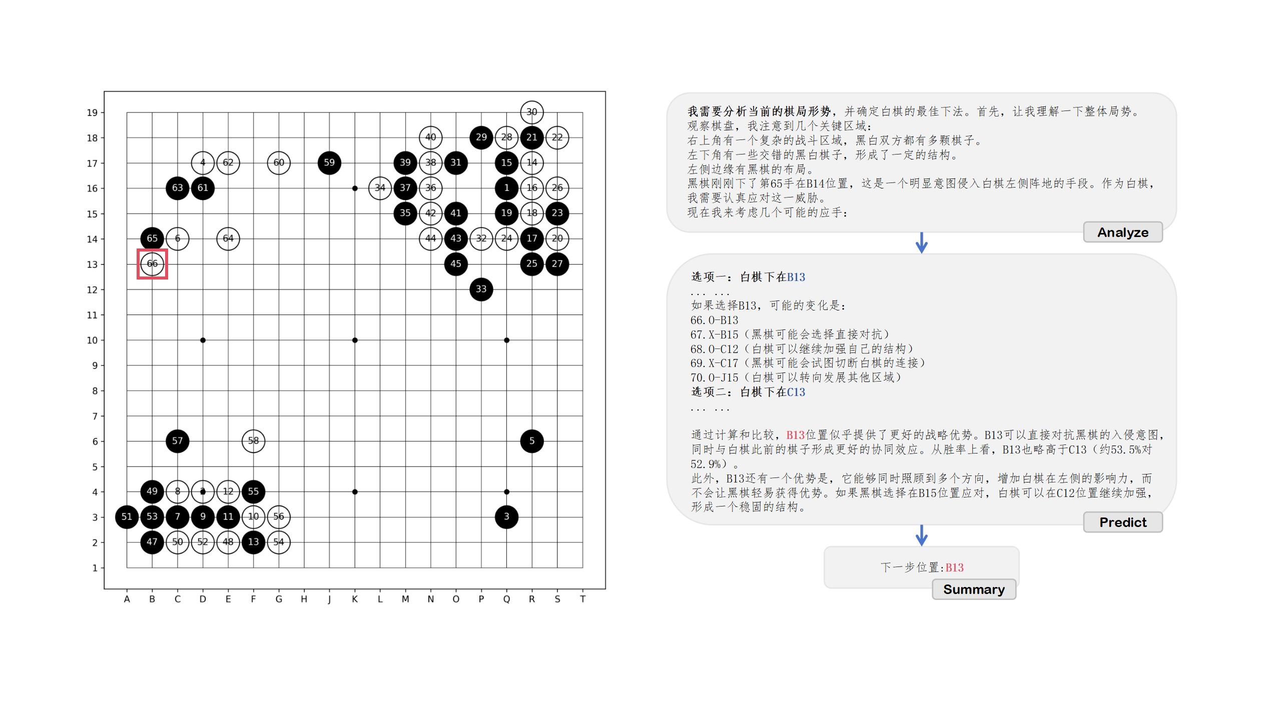 For a given state, InternThinker-GO first analyzes the situation on the board: "There is a complex battle area in the upper right corner, where both Black and White have multiple stones. The lower left corner has some interlaced Black and White stones, forming a certain structure. Black has a formation along the left edge. Black just played move 65 at B14, which is clearly intended to invade White's territory on the left side. As White, I need to respond carefully to this threat." Next, InternThinker-GO specifically predicts and analyzes potential moves such as B13, C13, and ultimately selects B13 as the placement position.