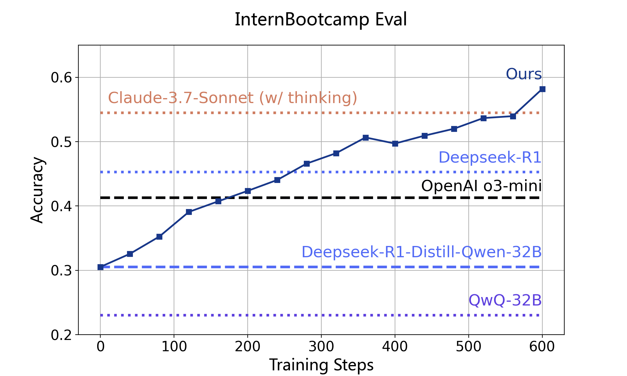 InternThinker-GOwith the InternGObootcamp in Internbootcamp.InternThinker-GOapproaches professional players using far fewer games than AlphaGO, which surpasses current reasoning models. Besides excellent performance,InternThinker-GOcan provide reasonable and inspiring thoughts, demonstrating the great potential of human-like reasoning, empowered with reinforcement learning, in tackling expert-level tasks. - Besides, mixing the bootcamps together, we find that there remains a large room for current reasoning models to improve in bootcamp tasks, but reinforcement learning can effectively improve their performance. Through training on merely 22k prompts mixed with all verified tasks, the outcome models successfully improve by 27% based on