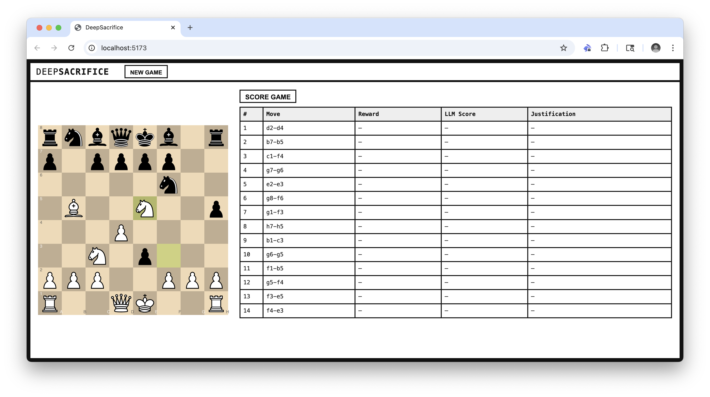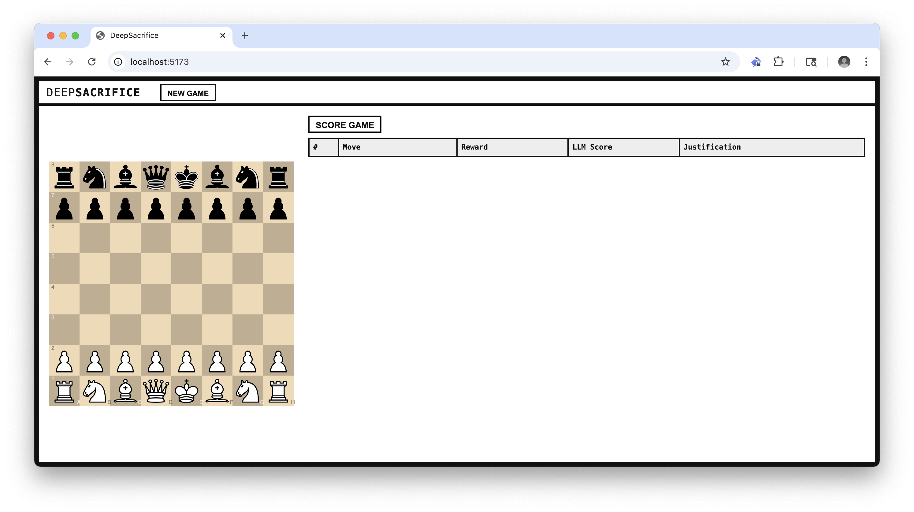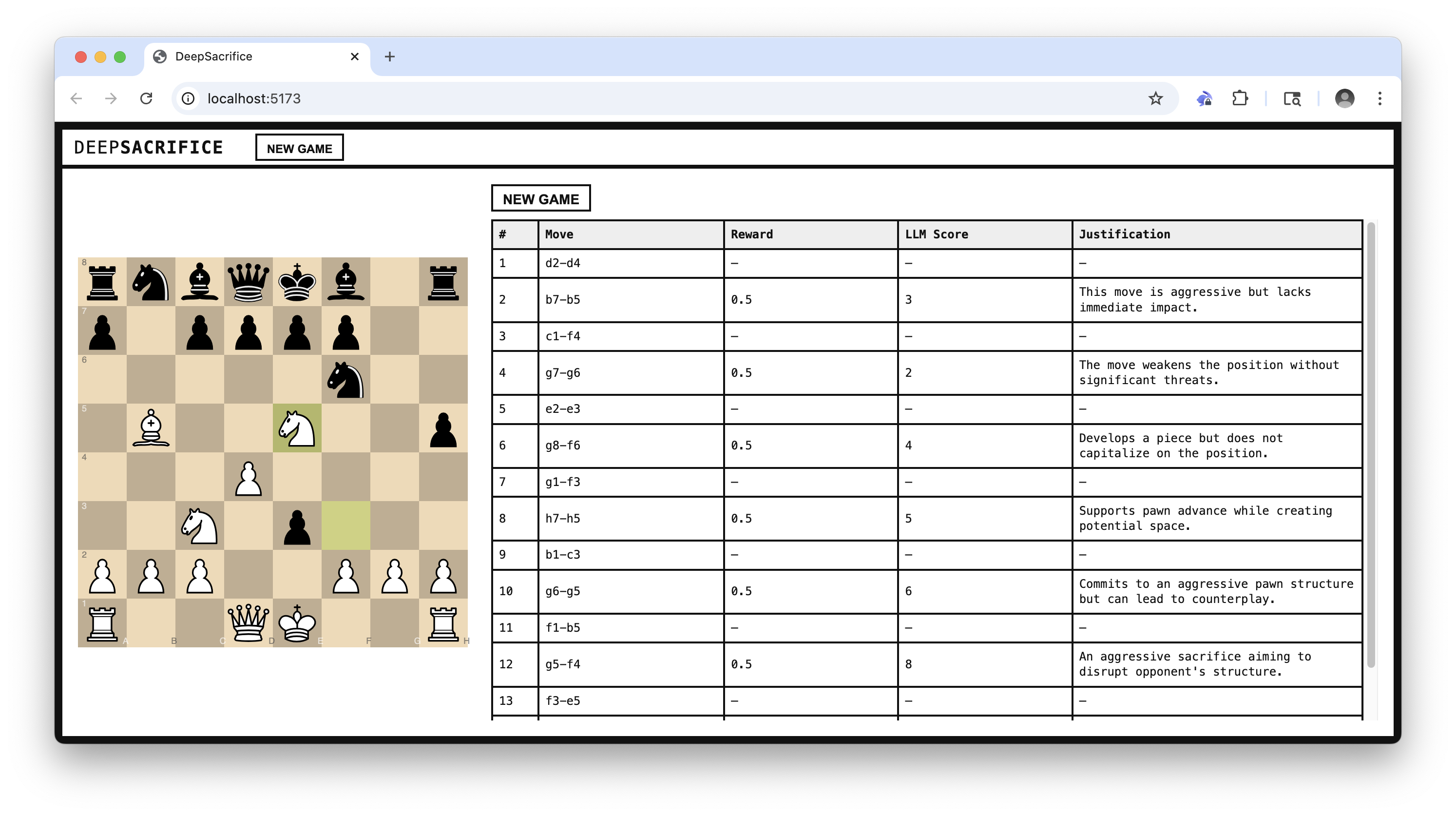 DeepSacrifice is a design prototype for a lightweight reinforcement learning (RL) loop in a chess environment. The goal is to train an agent to play aggressive, sacrificial, and attacking chess using feedback from direct human-vs-agent gameplay and post-game evaluations by a language model (LLM).