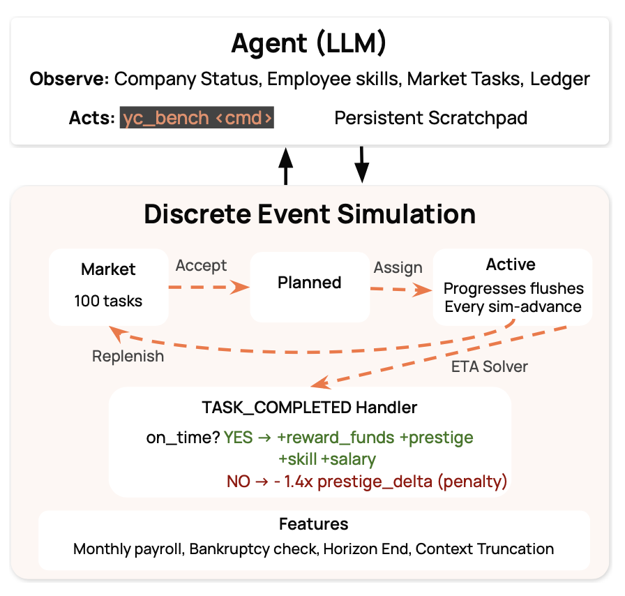 A long-horizon deterministic benchmark for LLM agents. The agent plays CEO of an AI startup over a simulated 13 year run, operating exclusively through a CLI tool against a SQLite-backed discrete-event simulation.