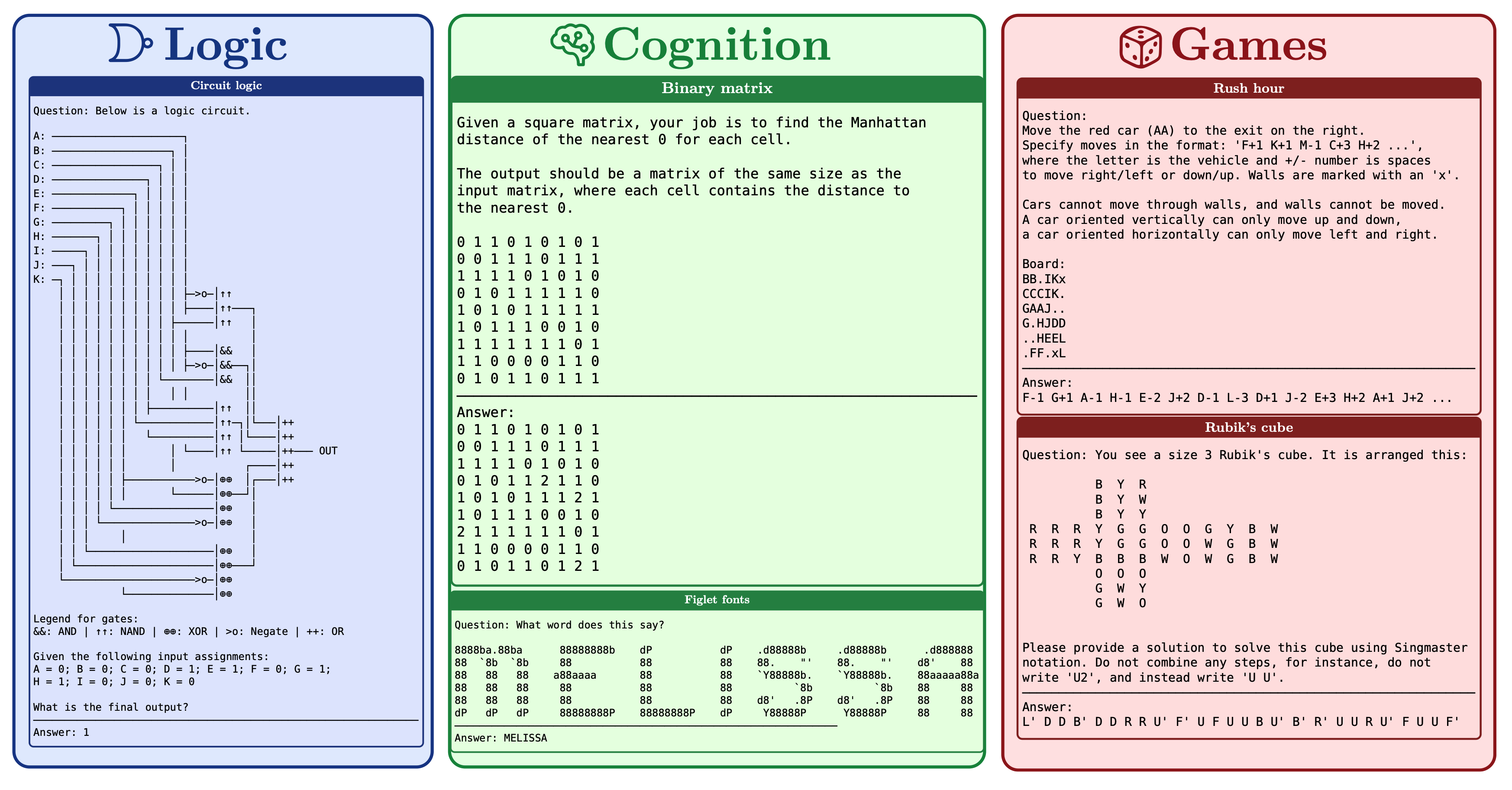 It currently provides more than 100 tasks over many domains, including but not limited to algebra, arithmetic, computation, cognition, geometry, graph theory, logic, and many common games.